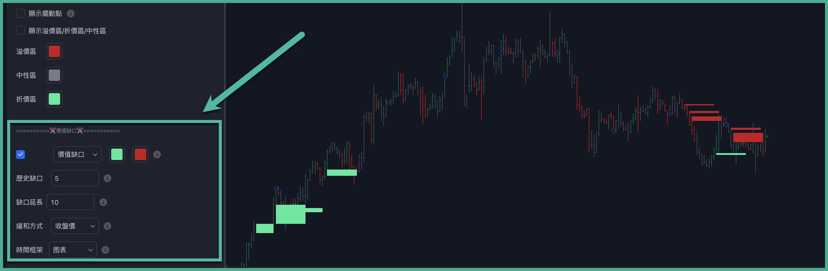 <table><thead><tr><th width="188">收盘价</th><th>当收盘价越过价值缺口的极值时得到缓解</th></tr></thead><tbody><tr><td>烛芯</td><td>当低点/高点越过价值缺口极值时得到缓解</td></tr></tbody></table>