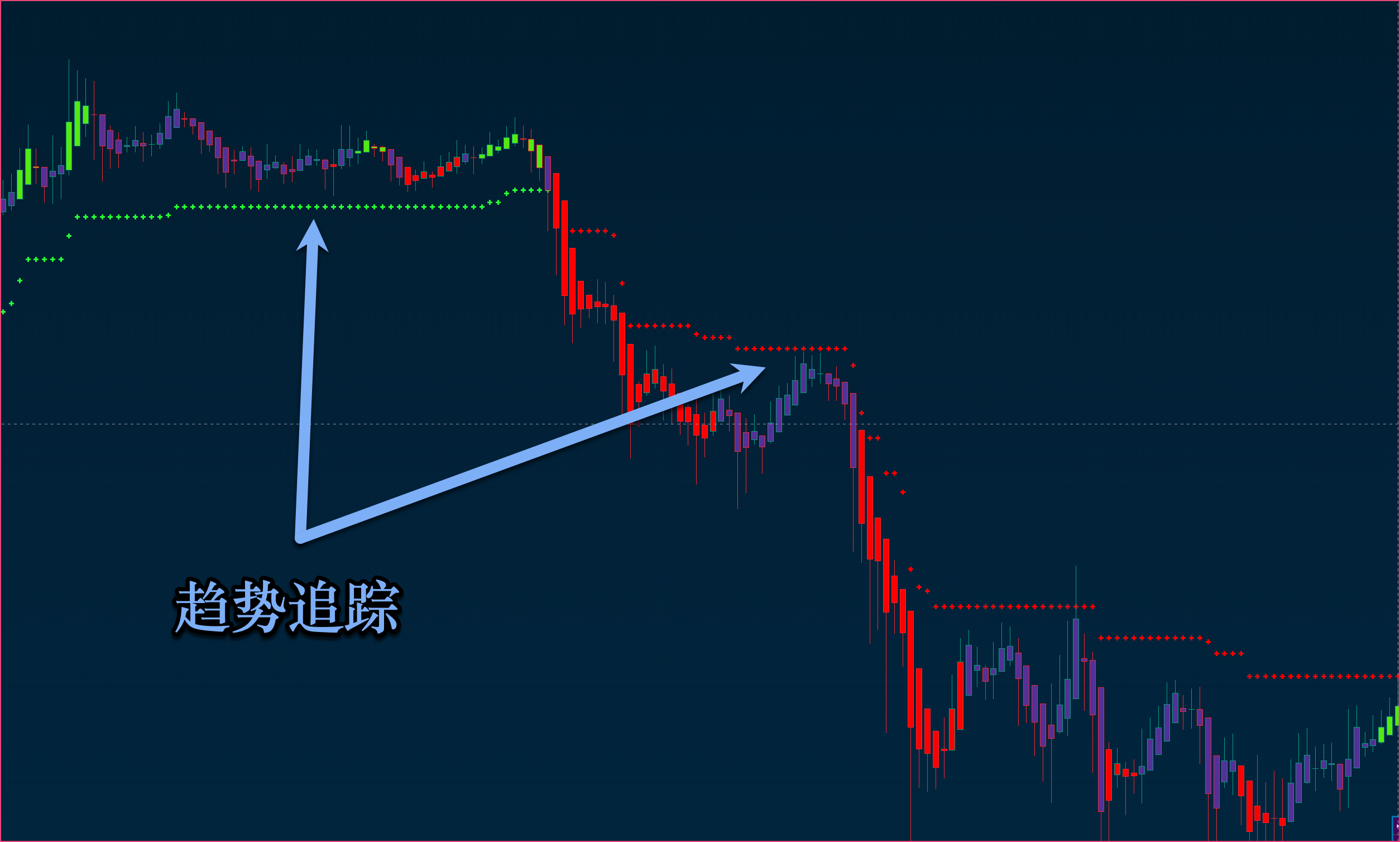 {% hint style="info" %} <mark style="color:blue;">**趋势追踪：趋势跟踪是一种趋势跟踪算法，趋势跟踪器可以用作跟踪支撑/阻力工具。也可以与确认信号结合使用，如到达趋势追踪位的加仓，或过滤短期信号等。**</mark>