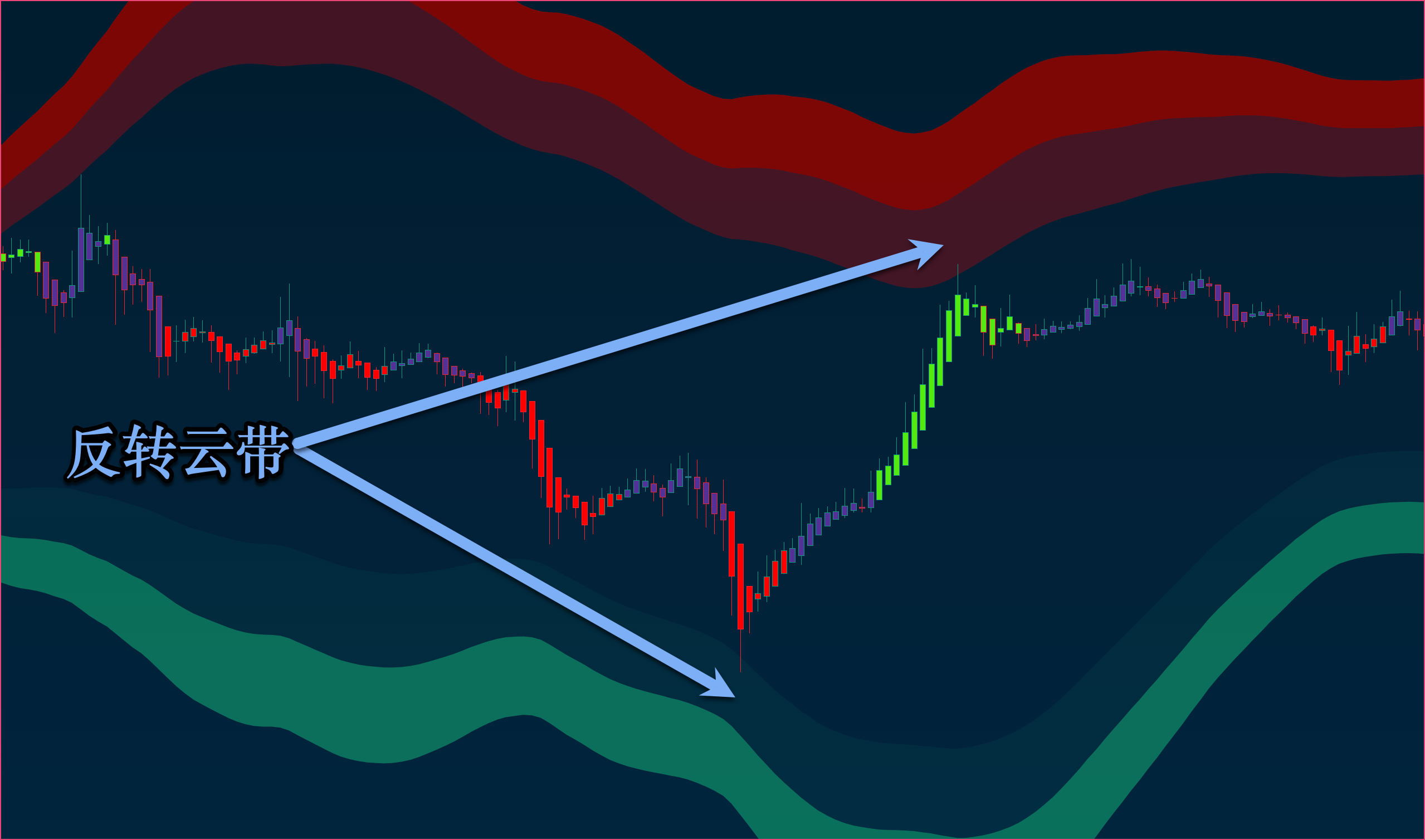 {% hint style="info" %} <mark style="color:blue;">**反转云带：TradingBox的反转云带与传统布林带的算法完全不同，引进了一种更先进的基于圆周的算法，启用后，图表上将显示一个上云带区和一个下云带区，每个区都旨在帮助用户找到顶部和底部，云带无论是在横盘行情还是趋势行情中都发挥作用，趋势行情中价格可依附云带进行，盘整行情中云带可帮助用户寻找早期入场点的绝佳区域。**</mark>
