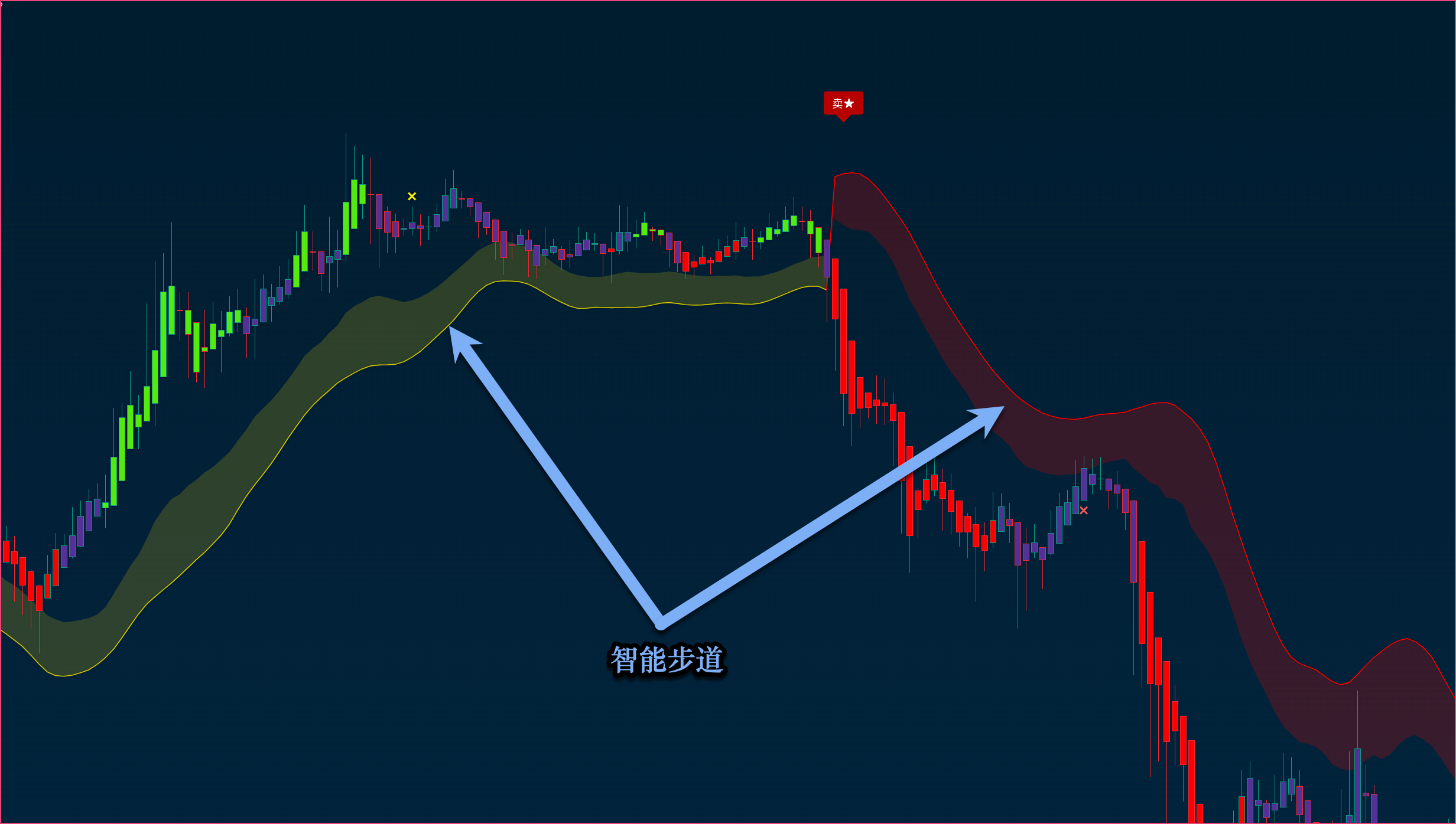 {% hint style="info" %} <mark style="color:blue;">**智能步道 ： 智能步道既可用作趋势追踪，也可用于跟踪止损；**</mark>\ <mark style="color:blue;">**当价格高于智能步道时表示上升趋势，当价格低于智能步道时，表示下降趋势；**</mark>\ <mark style="color:blue;">**上升趋势中绿色的步道表示支撑，下降趋势中红色的步道表示阻力。**</mark>