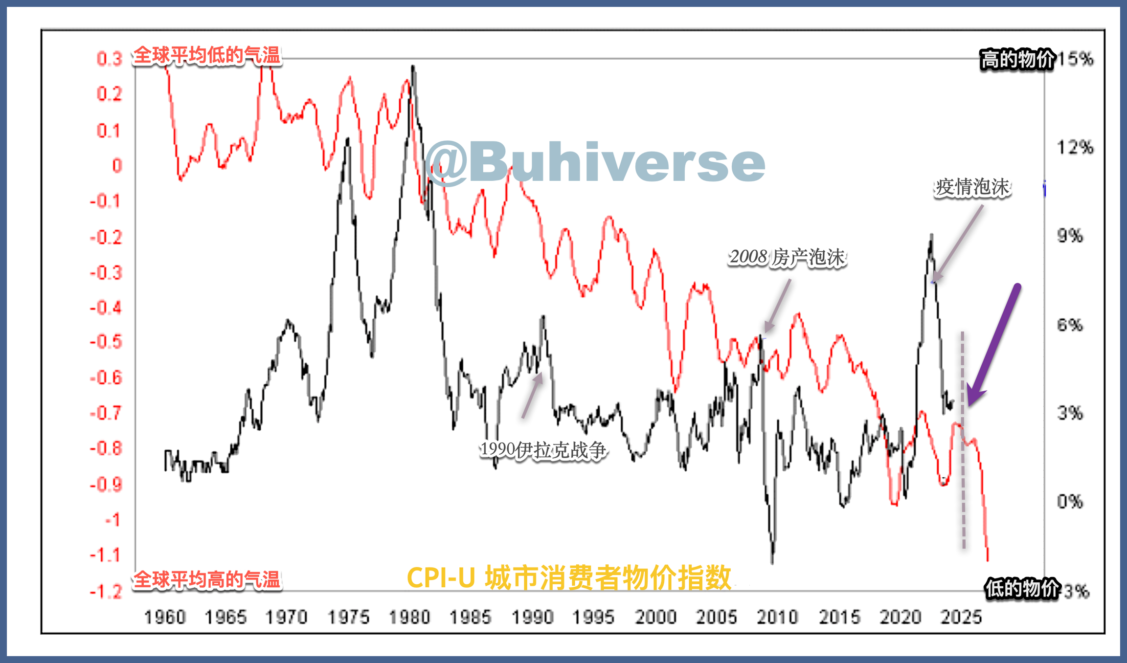 需要观察的重点并不是两个数据线的总体趋势,而是三年后温度波动与通货膨胀数据的波动相呼应的方式。我们在 20 世纪 70 年代看到的大规模通货膨胀是 1960 年代和 1970 年代寒冷期的回应。