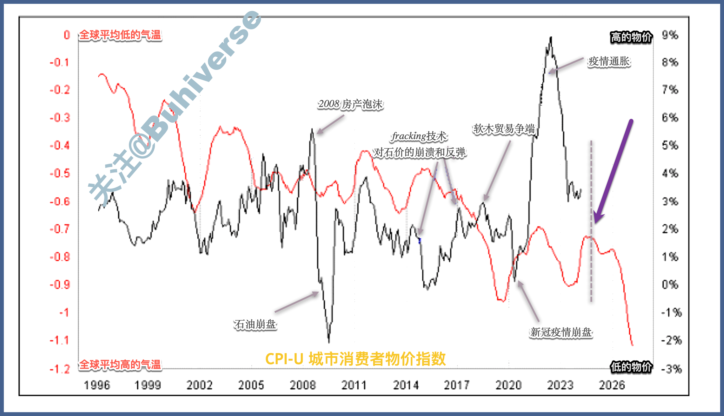 较低的温度对应较高的通胀,气温数据前移三年。
