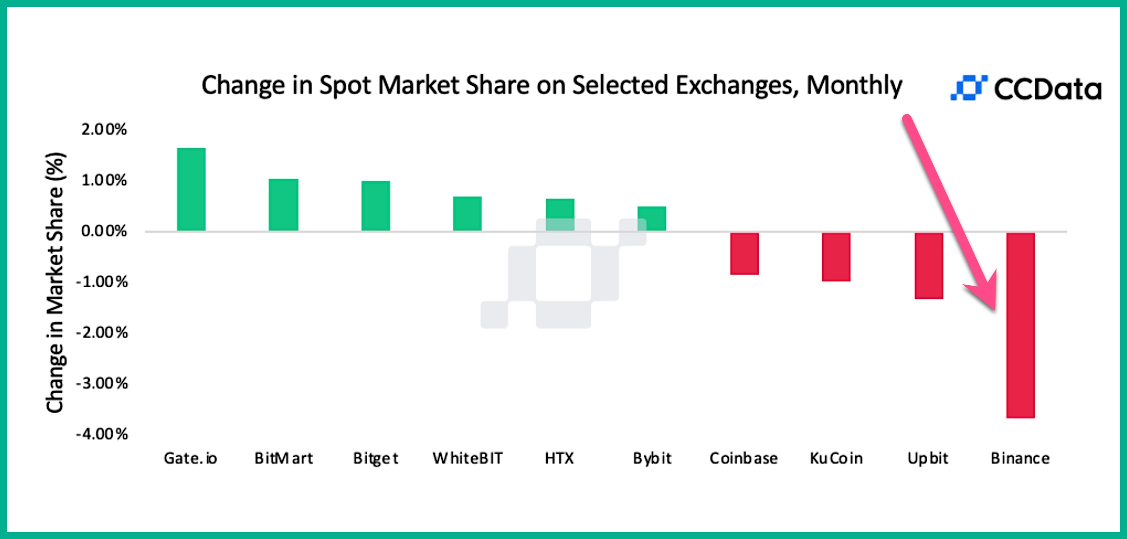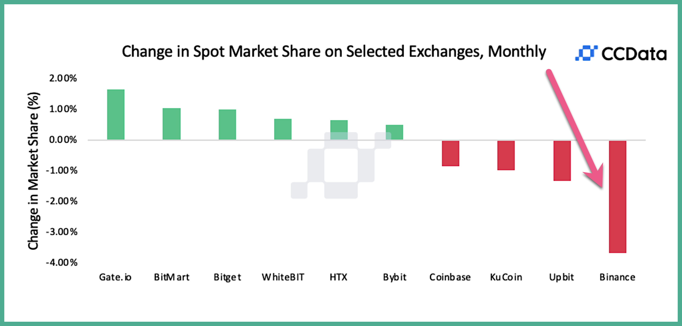 Binance 的现货交易量下降 39.2%,至 6790 亿美元,录得自 2023 年 9 月以来的首次下降。 而币安交易所的现货成交量同比下降 了3.69% 至 33.8%,录得自 2024 年 1 月以来的最低表现: