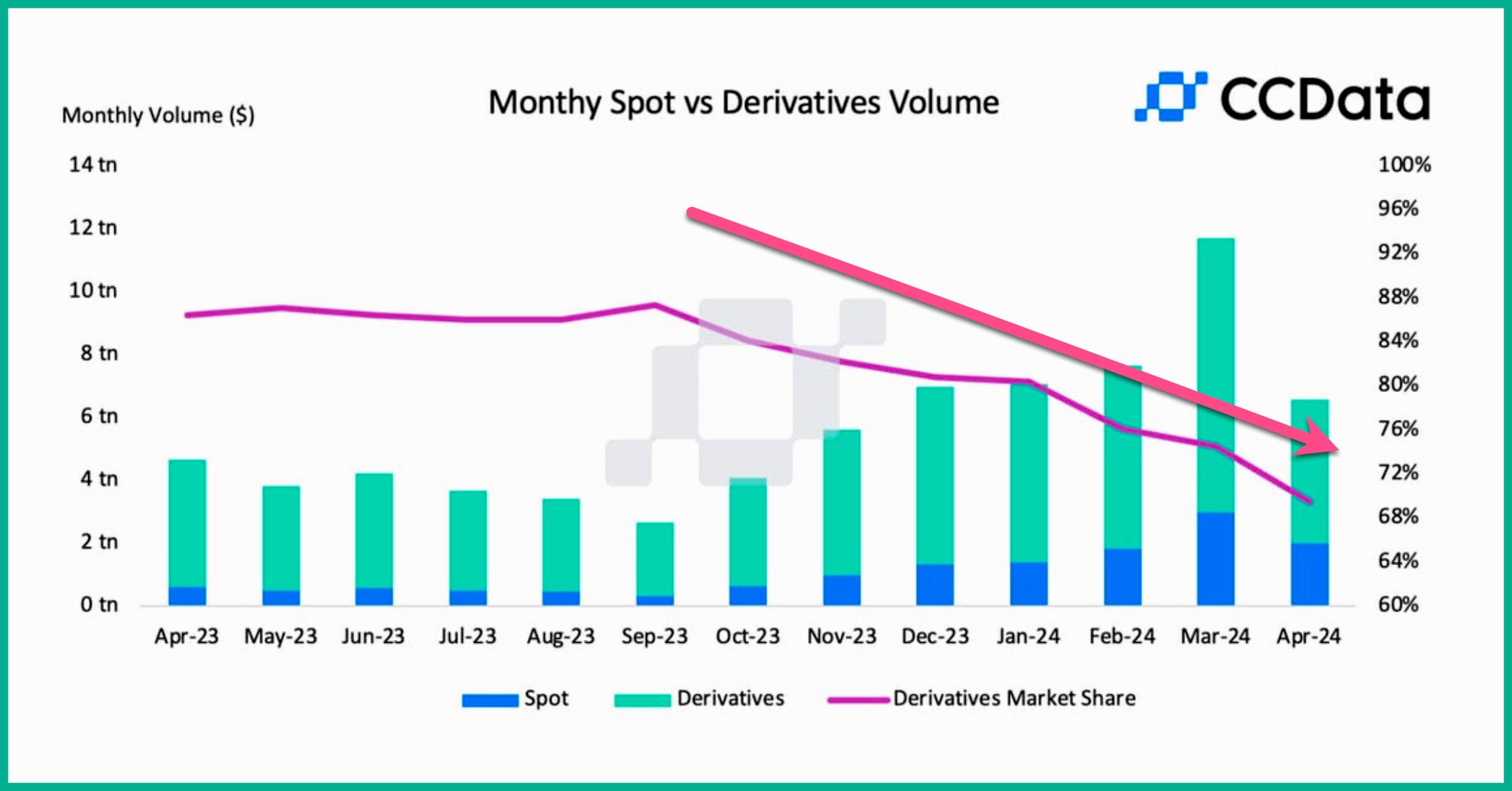 衍生品市场在加密货币交易里的主导地位也在连续下降 自2023年9月的88.3%市场比例,连续下降至当前的69.5%。(CCdata)